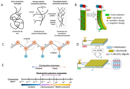 Classification and mechanisms of electroactive polymers (EAPs). (A) Various charge transport mechanisms in electroactive polymers; (B) schematic illustration of an ionic EAP system highlighting ion migration; (C) electron conduction in intrinsically conductive polymers via delocalized charge carriers; (D) structural representation distinguishing two primary categories of EAP-based actuators: ionic and electronic types, including ionic polymer–metal composites and dielectric elastomers; and (E) conductivity range comparison between intrinsically conductive polymers and electroactive composite materials. (Figure reproduced with permission, reference no. [16]). CC BY 4.0.