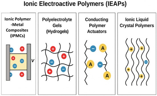 Ionic EAPs are characterized by their ability to deform due to the movement of ions within the polymer structure. Ionic polymer–metal composites (IPMCs) consist of an ion-exchange polymer like Nafion coated with thin metal electrodes. When a voltage is applied, cation migration causes bending due to electroosmotic flow. Their low-voltage operation and biocompatibility make them suitable for artificial muscles and biomedical actuators. Polyelectrolyte gels (hydrogels) swell or shrink in response to electric fields due to ion movement and osmotic pressure differences. Made from materials like poly(acrylic acid), they respond to electrical, pH, or ionic stimuli. They are ideal for drug delivery systems and soft tissue mimics. Conducting Polymer Actuators (e.g., Polypyrrole, PANI, and PEDOT) are conducting polymers that undergo reversible redox reactions, driving ion exchange and volume change. They provide tunable mechanical properties and operate under low power. Applications include biosensors, artificial muscles, and neural stimulation. Ionic Liquid Crystal Polymers (LCPs) respond to electric fields with an anisotropic shape or alignment changes, thanks to their ordered structure. Doping with ions enhances their responsiveness and electroactive behavior. They are promising for responsive optical elements and microfluidic devices. These polymers typically operate in aqueous or ionic environments and require the presence of electrolytes to function. One well-known example of an ionic EAP is the ionic polymer–metal composite (IPMC), which consists of a polymer membrane impregnated with an electrolyte and coated with metal electrodes on either side [18]. When an electric field is applied, the cations within the polymer move toward the cathode, causing the polymer to deform, thus acting as a soft actuator. The deformation is highly reversible, making these materials ideal for low-power, flexible actuators [6].