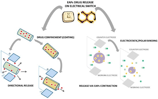 Electrically triggered molecular release mechanisms in electroactive polymers (EAPs). Figure reproduced with permission from reference [19], under the Creative Commons CC BY 4.0, https://doi.org/10.3390/polym8050185.
