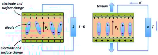 Mechanism of electro-induced actuation in piezoelectric polymer actuators. Figure reproduced with permission from reference [43], under the Creative Commons CC BY 4.0, https://doi.org/10.3390/polym13162713.