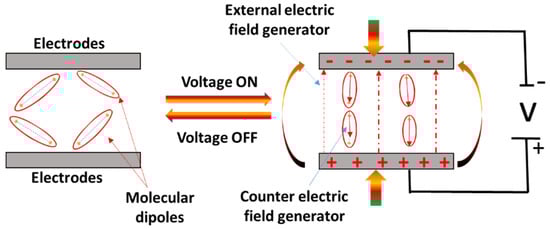 Schematic illustration of the polarization process of molecular dipoles in electroactive polymers (EAPs) under the influence of an external electric field, as applied in artificial muscle mechanisms.