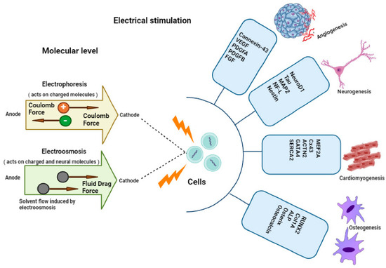Electronic EAPs, on the other hand, operate by applying an external electric field to cause charge redistribution within the polymer. The deformation in electronic EAPs is primarily a result of the electronic response of the polymer material, where external electrical stimulation induces mechanical movement. An example of this category includes dielectric elastomers, which are soft, stretchable materials that expand or contract in response to electric fields. These materials can be utilized for both actuation and sensing purposes, offering a range of biomedical applications in the form of prosthetics, artificial muscles, and flexible sensors [13]. Electroactive polymers have attracted significant attention because of their versatility, biocompatibility, and ability to integrate into soft, flexible structures. They provide unique solutions in biomedical applications where conventional materials, like metals or ceramics, may not be suitable due to their rigidity and bulkiness. Figure 3, depicting electrically stimulated molecular release using electroactive polymers (EAPs), represents a promising approach for controlled drug delivery and therapeutic applications. EAPs respond to electrical stimulation by undergoing conformational changes, ion migration, or redox reactions, which can be harnessed to regulate the release of bioactive molecules [19]. This “on-demand” release mechanism is particularly advantageous for precision medicine, enabling site-specific and temporally controlled drug administration. For example, polypyrrole (PPy)- and polyaniline (PANI)-based EAPs facilitate the electrochemical release of drugs, peptides, or growth factors in response to an external electrical trigger. Such smart systems can be applied in neural interfaces, tissue engineering scaffolds, and implantable drug delivery devices, improving therapeutic efficacy while minimizing systemic side effects. Future advancements in EAP-based molecular release systems may integrate biosensors and closed-loop control mechanisms for autonomous and adaptive drug release tailored to individual patient needs.
