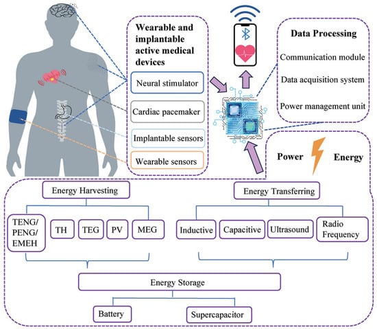 - Gao, Z.; Zhou, Y.; Zhang, J.; Foroughi, J.; Peng, S.; Baughman, R.H.; Wang, Z.L.; Wang, C.H. Advanced Energy Harvesters and Energy Storage for Powering Wearable and Implantable Medical Devices. Adv. Mater. 2024, 36, 2404492. [Google Scholar] [CrossRef] [PubMed]