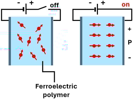 Dipole alignment in ferroelectric polymers. In the absence of an electric field (off), molecular dipoles are randomly oriented. When a field is applied (on), dipoles align along the field direction, generating a net polarization (P) across the polymer film.