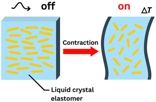 Liquid crystal elastomers (LCEs) are soft, stimuli-responsive materials that exhibit large, reversible deformations by coupling the anisotropic behavior of liquid crystals with the elasticity of crosslinked polymer networks. Their actuation arises from the reorientation of mesogenic domains, rod-like liquid crystal molecules, triggered by external stimuli such as heat, light, electric, or magnetic fields. Upon stimulation, mesogens undergo a nematic-to-isotropic phase transition, leading to contraction along the director axis and producing macroscopic shape changes [,].