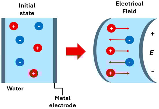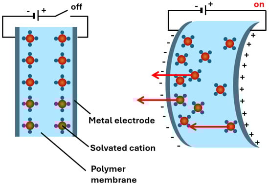A typical actuation mechanism is illustrated in Figure 5: when an electric field is applied, mobile ions within the gel migrate asymmetrically, generating local osmotic gradients that induce bulk deformation.