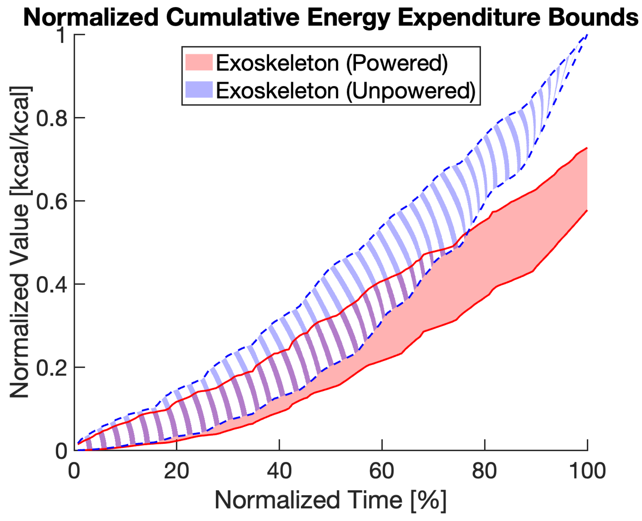 A plot illustrating the upper and lower bound for energy expenditure of a subject during the trial exercises. The energy, derived from and , is normalized to peak energy expenditure per subject across both exoskeleton conditions, and the times are normalized to percent time relative to total time of exercise. The areas represent the region between max and min trajectories per condition across all valid subjects.