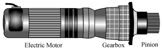 Electric actuators for pitch, as well as yaw systems, consist of an electric motor, a gearbox to reduce the speed and increase the torque, and a pinion that engages with a gear rim and the bearing attached to the rotor blade [17], as shown in Figure 1.