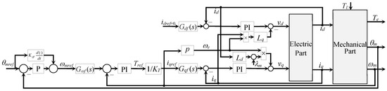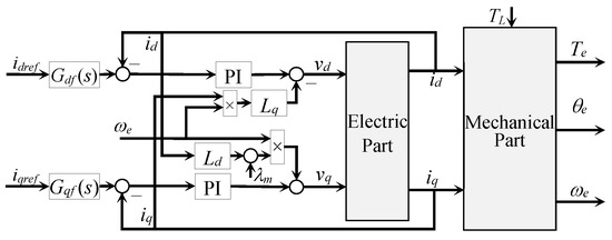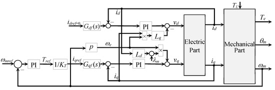 There is some consensus that most internal control loops include classic PI controllers for the current control, whose control signals are the voltage references for the PWM system. From Equations (2) and (3), it is clear that the model is nonlinear because of the cross-coupling terms (−Lq iq ωe) in (2) and (Ld id ωe + λf ωe) in (3). Thus, these nonlinearities can be compensated by adding these terms to the PI controllers in a feedforward form, namely