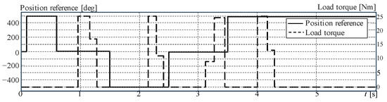 Reference signal and load torque used during the simulation of the position-controlled PMSM.
