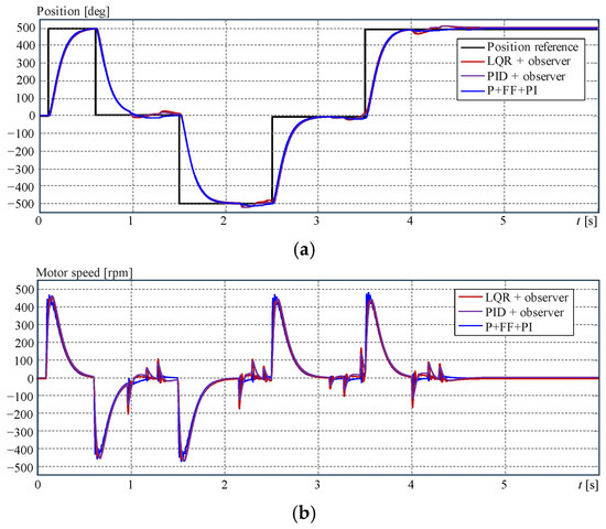 Simulation results for the PMSM position control systems. (a) Position output, (b) speed output.