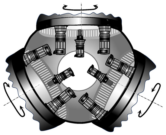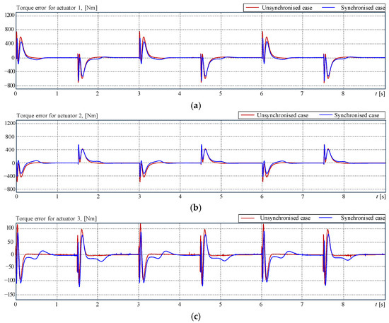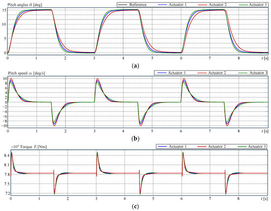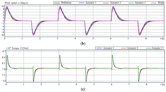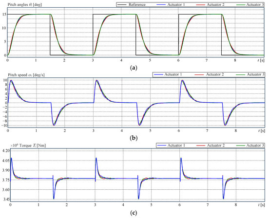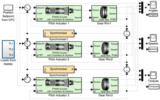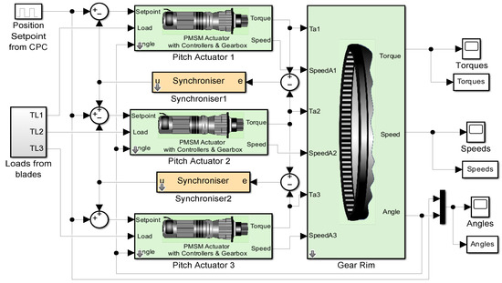 The blade actuation has an additional complication in the case of the collective pitch control (CPC) [2]. The CPC requires that all three blades be pitched at the same angle at the same time. However, this goal is not simple to reach because of the small constructive differences between actuators, even when they are provided with internal controllers. Thus, actuators either acting on the same joint or following the command given by the CPC have to be synchronised not only for the best performance but also to care for motors and gearboxes. In all cases, the yaw controller, as well as the pitch controller, are single controllers that have to dominate several actuators simultaneously. Thus, the matter can be seen as a multimotor synchronous control problem [3,4]. See, for instance, ref. [5] for a review of methods. The matter is also a synchronisation problem of ‘n’ non-identical plants with one controller. This kind of control problem was studied at the end of the 1980s and the beginning of the 1990s. The control problem of n identical plants is presented in [6,7,8,9], and the case of n non-identical plants can be found in [10,11,12,13,14]. These approaches can be treated as a variation of the cross-coupled control system, which was initially introduced in [15] and the later simplified version called the adjacent cross-coupled control system [16].