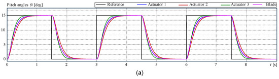 For the testing of wind turbine models, as well as control approaches, by means of simulations, it is common to use basic models for the actuators, such as, for example, first-order models (e.g., [18,19,20]) or second-order models, like [21,22,23]. For this research, the model dynamics of actuators should be more accurate.