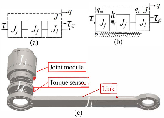 Joint diagram. (a) Schematic diagram of rigid robot model. (b) Robot joint model with torque sensor dynamics. (c) SolidWorks model of a robot joint module with torque sensor. The nominal parameters are , , , , and .