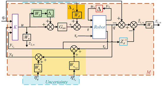 where M combines the generalized plant P and controller K. This formulation explicitly captures structured and unstructured uncertainties through the block. and are the perturbation inputs and outputs, respectively. w denotes the exogenous input typically including command signals, disturbances, noises, etc.; z denotes the error output usually consisting of the regulator output, tracking errors, filtered actuator signals, etc. The signals y and u represent the feedback signals (measured output, tracking error, etc., as the input to the controller) and the control signal (the output from the controller), respectively.