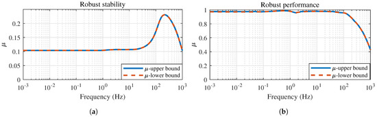 Each iteration of controller synthesis involves updating , recomputing the structured singular value , and performing D-K iteration to synthesize a new robust controller. Structured singular value analysis provides a rigorous means to verify whether the closed−loop system satisfies robust stability and robust performance under parametric and dynamic uncertainties. The upper bound of across all frequencies is monitored to ensure it remains below unity, which confirms that the system maintains desired performance while tolerating modeling errors, external disturbances, and actuator variations. This closed−loop iteration continues until both the impedance/admittance tracking metrics and the robustness margins converge to satisfactory levels.
