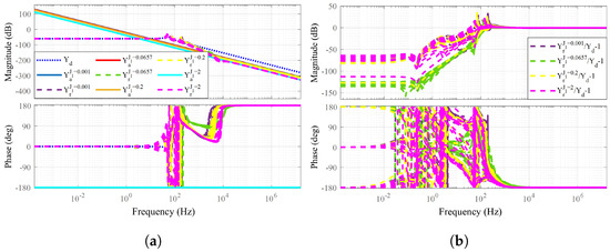 To analyze the passivity effect of the desired impedance on the robot’s rendered impedance, we evaluate the IFP index of the rendered impedance. Under passive conditions, the relative order of the analysis system is at most 1, and the robot’s desired, inherent, and rendered admittances are represented as , , and , respectively. Figure 15 illustrates the frequency−dependent variation of the IFP index v under high− and low−stiffness impedance parameters. For high−stiffness impedance, exhibits passivity excess, while shows a minor excess. In the controlled state, maintains a robust passivity excess, particularly at low frequencies, ensuring stable interaction. Conversely, under low−stiffness impedance conditions, demonstrates greater passivity excess, and achieves excess primarily at higher frequencies.