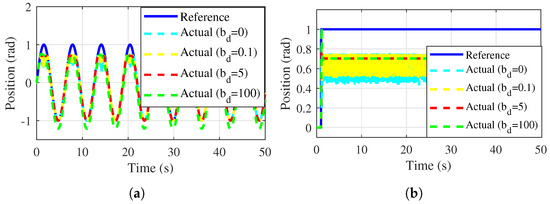 Effect of on performance. The robot renders a lower desired stiffness of , and is set to 0, 0.1, 5, and 100 Nm/(rad/s), respectively. (a) Tracking the sinusoidal signal . (b) Tracking the step signal.