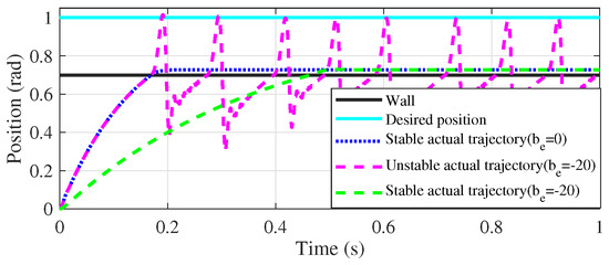 To analyze the impact of negative damping in the environment on contact stability, we investigated the robot’s behavior during interaction with a viscoelastic wall. During contact, the robot exhibited oscillatory behavior characterized by alternating contact and separation, commonly referred to as contact instability [37]. Figure 13, shows when the environment damping () exacerbates oscillatory behavior, significantly destabilizing the interaction. This instability arises from the amplification of energy dissipation inconsistencies caused by the negative damping, which prevents the system from achieving a stable equilibrium. To address this issue, the weighting function , stabilizing the interaction from unstable to stable contact.