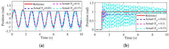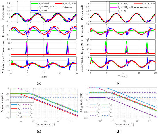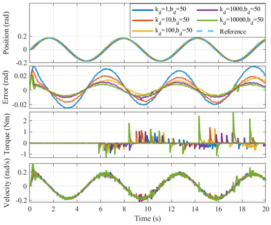 Additionally, parametric uncertainty was considered by attaching weights at the link end to vary the effective inertia. Figure 19 illustrates the effect of different desired stiffness values (, 10, 100, 1000, and 10,000 Nm/rad) with a fixed damping coefficient ( Nm/(rad/s)). The position is a continuous function of time, and in trajectory tracking, the goal is to closely follow the reference trajectory . To evaluate performance, we used the mean absolute position error