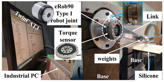 To evaluate the effectiveness of the proposed control methods, a series of experiments were conducted using a one−DoF modular robotic joint platform (see Figure 16). The experimental setup incorporates a ZeroErr eRob90N100I-BS-18ET actuator module (ZeroErr Technologies, Shenzhen, China), which features an integrated actuator with dimensions of mm and a mass of 2.1 kg. The actuator includes a precision harmonic drive with a 100:1 reduction ratio and a 20-bit multi-turn encoder, offering a repeatability of arcsec and an absolute accuracy of arcsec. The control system consists of a Beckhoff C6930-0060 industrial PC (Intel Core i5-4400E @ 2.7 GHz, Beckhoff Automation, Verl, Germany), a C9900-L100 license key USB stick for TwinCAT 3.1 (Beckhoff Automation, Verl, Germany), and EtherCAT-based I/O peripherals including an EK1100 coupler, EL3102 analog input terminal, and EL9011 end terminal. Real-time control was implemented using MATLAB 2018b and Simulink xPC Target at a sampling frequency of 1 kHz. Torque measurement employs a SUNRISE M2210G7 sensor (Sunrise Instruments, Nanning, China), which features a measurement range of 0–100 Nm, a torsional stiffness of Nm/rad, and a sensitivity of V/EU. The sensor exhibits nonlinearity of FS and hysteresis of FS. In the experiments, silica gel with Shore A hardness of served as the interaction object, simulating soft material contact.