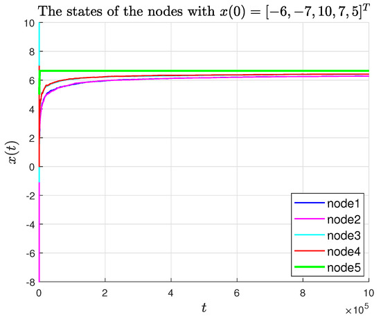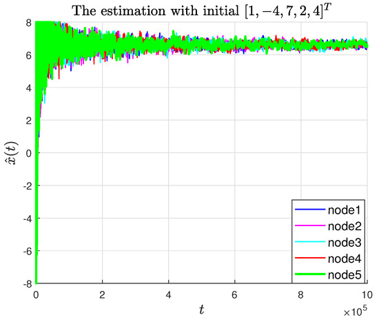- Initialization: The initial state of each agent and its estimations of the initial states of its neighbors are as follows:for , , and . Here, , which is a known boundary for the states.