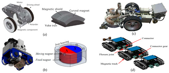 Adhesion is a critical determinant for ensuring the operational stability of wall-climbing robots. Excellent adhesion characteristics not only ensure stable adhesion of robots on different types of wall surfaces but also enable them to effectively cope with complex working environments, such as vertical, inclined, and curved surfaces, under various conditions. The choice of adhesion method directly affects a robot’s mobility, load-bearing capacity, and operational efficiency. When wall-climbing robots perform tasks such as high-altitude operations, inspections, and maintenance, the quality of their adhesion performance determines whether they can complete these tasks safely and efficiently. Therefore, optimizing the adhesion method and enhancing adhesion are important directions in the research and development of wall-climbing robot technology. Currently, wall-climbing robots mainly use three adsorption methods: negative-pressure adsorption, biomimetic adsorption, and magnetic adsorption [6,7]. Among them, while the principle of negative-pressure adhesion is simple, its energy consumption during continuous adhesion–detachment cycles is high, which significantly limits the robot’s mobility [8]. Bionic adsorption is mainly based on imitating the adhesion principles of the feet of natural organisms, including grasping methods based on claw-like structures [9,10] and adhesion methods based on van der Waals forces generated between microstructures and the contact surface [11]. It is suitable for rough surfaces but gives the robot a relatively slow movement speed and low load capacity [12]. In contrast, permanent magnet adsorption has strong adhesion, low power consumption, and high working stability [13,14], and this technology has been extensively studied by scholars due to its stability and reliability [15,16]. Wall-climbing robots applied to steel walls mainly include tracked robots and wheeled robots [17]. C. Park et al. designed and produced a modular wall-climbing robot, R-Track [18], that can be separated into pairs. R-Track consists of three tracked wall-climbing robots, and each module is connected with a magnetic connector to enable transitions between vertical walls, but it does not have sufficient load capacity to carry the working module. Kosuke Nagaya et al. designed a tracked vehicle that can crawl on surfaces with small curvatures [19], but it cannot transition between different walls. Although wall-climbing robots with permanent magnet wheels are flexible, there is a small contact area between their wheels and the wall, resulting in weaker magnetic adhesion [20]. Moreover, the contact-type magnetic attraction mechanism cannot actively adjust the attraction force and may experience wear.