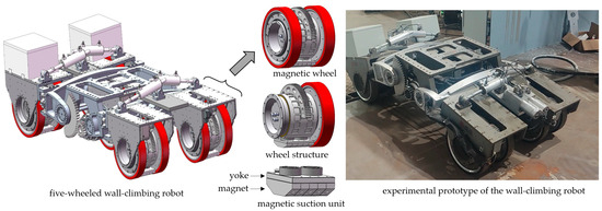 A wall-climbing robot’s adsorption capabilities predominantly hinge on the performance of its magnetic attraction unit. The quality of the unit’s design is a determining factor for a robot’s stability and operational efficiency across different wall surfaces. Therefore, in-depth design parameter research, simulation analyses, and experimental verification of magnetic attraction units are crucial for promoting the advancement of wall-climbing robot technology. This study designs a swinging magnetic adhesion mechanism and adjustable connectors to optimize the angle and distance between the magnetic adhesion unit and the wall. Meanwhile, it proposes a method for optimizing the design parameters of magnetic adsorption units, and through a combination of simulations and experiments, it verifies the stability of wall transitions and load adhesion. Figure 2 presents our five-wheeled wall-climbing robot with some of its magnetic adhesion units labeled; there is one magnetic adhesion unit in each of the five wheels. The rest of this paper is organized as follows. Section 2 discusses the design and simulation analysis of the magnetic adhesion unit, including the key design parameters such as the magnet and yoke thickness, as well as the effects of the distance and angle between the adhesion unit and the wall. Section 3 introduces the magnetic attraction wheel, an important component of the wall-climbing robot. Section 4 presents the experimental validation, comparing the simulation results with the actual results of test conducted on various surfaces. Finally, Section 5 presents our conclusions and discusses future work that can be conducted to further optimize the magnetic attraction system of the wall-climbing robot and enhance its performance in complex environments.