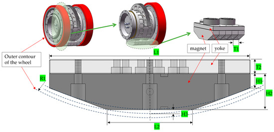 In order to achieve an optimal balance between magnetic adhesion performance and the mechanical structure of the wheel system, a new type of swinging magnetic adhesion unit was designed. It is composed of a combination of yoke and magnets magnetized in a Halbach array, located at the center of the wheel foot, and can rotate coaxially with the wheel foot. The design structure and a cross-section of the magnetic adhesion unit are shown in Figure 3. Its structure is mainly restricted by the length of the yoke, the length of the upper and lower ends of the magnet, and the height of the magnet. Its size parameters are shown in Table 1.