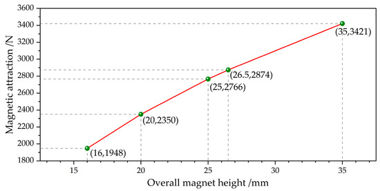 Compared to the yoke thickness, the magnet height has a more significant impact on the magnetic force. The basic overall height of the magnet is 15 mm. On this basis, the magnet’s overall height was continuously increased for the simulation to obtain the magnitude of the magnetic adhesion unit’s magnetic force at different magnet heights. The simulation results of this analysis are shown in Figure 5, which can be approximated as a linear variation.