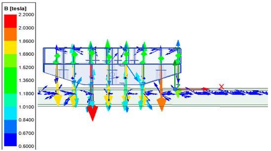 The magnetic adhesion force between the magnetic adhesion unit and the wall at different distances was measured in the simulation software Maxwell (AnsysEM21.1). A vector distribution diagram of the magnetic flux density of the magnetic adhesion unit in space is shown in Figure 6. The results were fitted with data to obtain the relationship between the magnetic adhesion force and the distance between the magnetic adhesion unit and the wall, as shown in Figure 7.