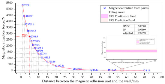 The fitting results were obtained in MATLAB (R2021b) using an exponential regression model and the Trust-Region algorithm. Both the R2 and adjusted R2 were 0.9999, the root-mean-square error (RMSE) was 7.06389, and the range of magnetic force variation was in the order of 103, indicating that the error was very small, with a 95% confidence boundary. Under normal working conditions, there is a distance of 5 mm between the magnetic adhesion unit of the wall-climbing robot and the wall surface, with a fitted magnetic adhesion force of 2760 N and a simulated magnetic adhesion force of 2766 N. The error was only 0.25%, indicating that the fitting is highly effective.