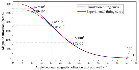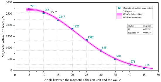 In MATLAB (R2021b), a Gaussian regression model and the Trust-Region algorithm were used to obtain the following fitting curve for the relationship between the magnetic adhesion unit’s angle in relation to the wall surface and the magnetic force during the experiment: