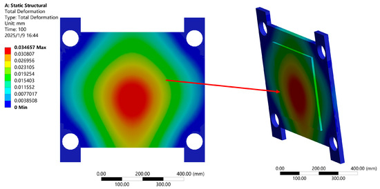 Unlike the simulation environment, the strong magnetic force generated by the magnetic attraction unit in the experimental environment not only provided adsorption to the steel plate but also caused bending deformation, resulting in changes in the distance between different parts of its surface. Therefore, a Q235 steel plate with dimensions of 400 mm × 400 mm × 11 mm was selected as the simulation object. In the Maxwell software (AnsysEM21.1) simulation environment, the steel plate was divided into 25 equivalent regions to analyze the magnetic force distribution, and the magnetic force concentration in different regions was obtained through vector analysis. We applied equal force to the same object on the workbench while configuring the properties of the Q235 steel plate as follows: density of 7860 kg/m3, Young’s modulus of 208 MPa, Poisson’s ratio of 0.277, and yield strength of 235 MPa. The constraints were set according to the experimental conditions, with the steel plate and the aluminum alloy plate behind it as binding constraints and the holes in the aluminum alloy as fixed constraints. The simulation results show that the area directly below the magnetic attraction unit had the largest deformation due to the concentration of magnetic force, which reached 0.0347 mm. The overall deformation is shown in Figure 9.