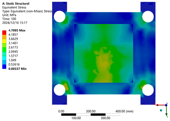 The deformation was significantly reduced in the area close to the fixed support. The stress was distributed in the magnetic concentration and support areas, reaching about 3.5 MPa. A stress distribution diagram is shown in Figure 10.