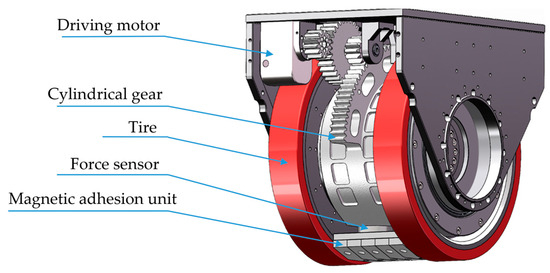 As specialized robots capable of performing tasks in complex wall environments, the performance and stability of wall-climbing robots rely heavily on the design of their attachment mechanisms. The wall-climbing function of these robots mainly relies on magnetic adhesion wheels, which are composed of magnetic adhesion units, force sensors, cylindrical gear pairs, driving motors, and wheels, as shown in Figure 11. By generating sufficient adhesion force, the robot can firmly adhere to the wall and adapt to complex working conditions such as different inclination angles and wall transitions.