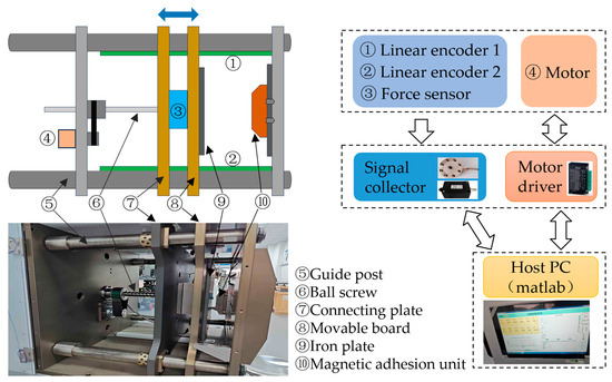The experimental system for testing the adsorption force between the magnetic adhesion unit and wall surface is shown in Figure 13. The system mainly consisted of guide posts, a connecting plate, a movable board, an iron plate, and a ball screw. The connecting plate and movable plate were installed and constrained on four guide posts, with the force sensor (656C-500 Kg) installed between them. The iron plate was assembled on the movable board. A motor (KGM-20CLKES, KAIXUAN, Suzhou, China) drove the ball screw to move the movable and connecting plates left and right on the guide posts. Two linear encoders (KA300-320, SINO, Guangzhou, China) were installed on the top and bottom of the guide posts, respectively. During the experiment, the magnetic adhesion unit was fixed on the load plate at the end of the platform, and the force sensor and movable board were placed in their original positions. The movable board moved forward along the guide posts until it reached the predetermined end point, reducing the distance between the magnetic adhesion unit and the iron plate, with the end position 2 mm away from the magnetic adhesion unit. The forward speed of the movable board was 0.1 mm/s.