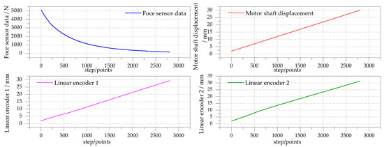 The system synchronously collected data from two linear encoder sensors, the force sensor, and the motor shaft displacement output. As shown in Figure 14, 2804 data points were collected during one measurement process, with a timestamp range of [14:35:41.082, 15:22:24.000]. This simulation showed that the magnetic force was concentrated in the area directly below the magnetic attraction unit, and the upper and lower areas were subjected to unequal forces, resulting in different offset distances. So, there was a little deviation between the data of linear encoders 1 and 2 in Figure 14. Using the mean method, the data were processed to obtain the actual distance between the magnetic adhesion unit and the iron plate.