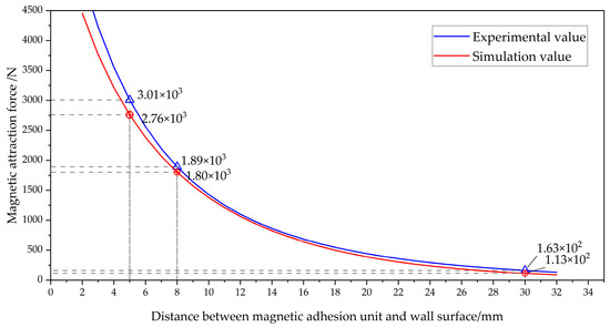 Comparison of simulated and experimental correlations between magnetic adhesion force and distance between magnetic adhesion unit and wall surface.