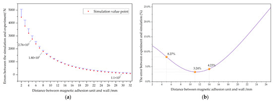 The errors between the simulation and experiment when the magnetic adhesion unit was at different distances from the wall. (a) Error bar; (b) Error ratio.