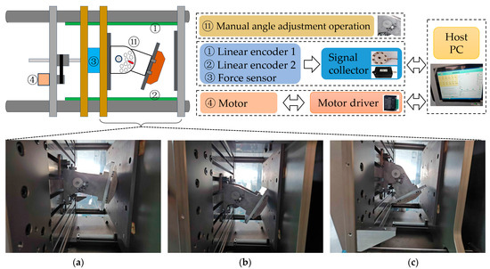 The experimental system for testing the adsorption force at different magnetic adhesion unit angles is shown in Figure 17. Based on the experimental platform shown in Figure 13, the supporting mechanism was located on the movable board. The magnetic adhesion unit could rotate around the central axis of the supporting mechanism, on the surface of which there were evenly spaced 10-degree pin holes. The angle adjustment between the magnetic adhesion unit and the wall surface was performed manually, with the rotation center axis of the supporting mechanism functioning as the wheel center of the wall-climbing robot. We set the distance from the outer surface of the magnetic adhesion unit to the center (the rotation radius) to 155 mm and measured the magnetic force changes during the rotation of the magnetic adhesion unit in sequence, sampling at intervals of 10 and recording the magnetic force changes. Figure 17a–c show the test states when the magnetic adhesion unit angles were 10, 30, and 60, respectively. Comparison curves between the simulation and experiment are shown in Figure 18.