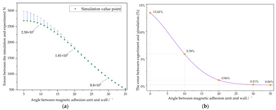 The error between simulation and experimental results when the magnetic adhesion unit is at different angles from the wall. (a) Error bar; (b) Error ratio.
