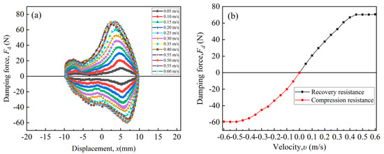 Figure 4 presents the mechanical properties of the MR damper. As shown in Figure 4a, as the vibration displacement x varies from −10 mm to 10 mm, the damping force of the MR damper first increases and then decreases, and it reaches the maximum value when the x is 6 mm. Figure 4b demonstrates that the damping force gradually increases with increasing shear velocity, and approaches a maximum value of about 70 N when the shear velocity reaches 0.5 m/s. Based on these results, the damping coefficient k and stiffness coefficient c of the damper can be calculated using Equations (1) and (2) [31].