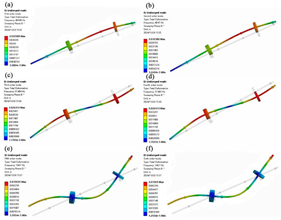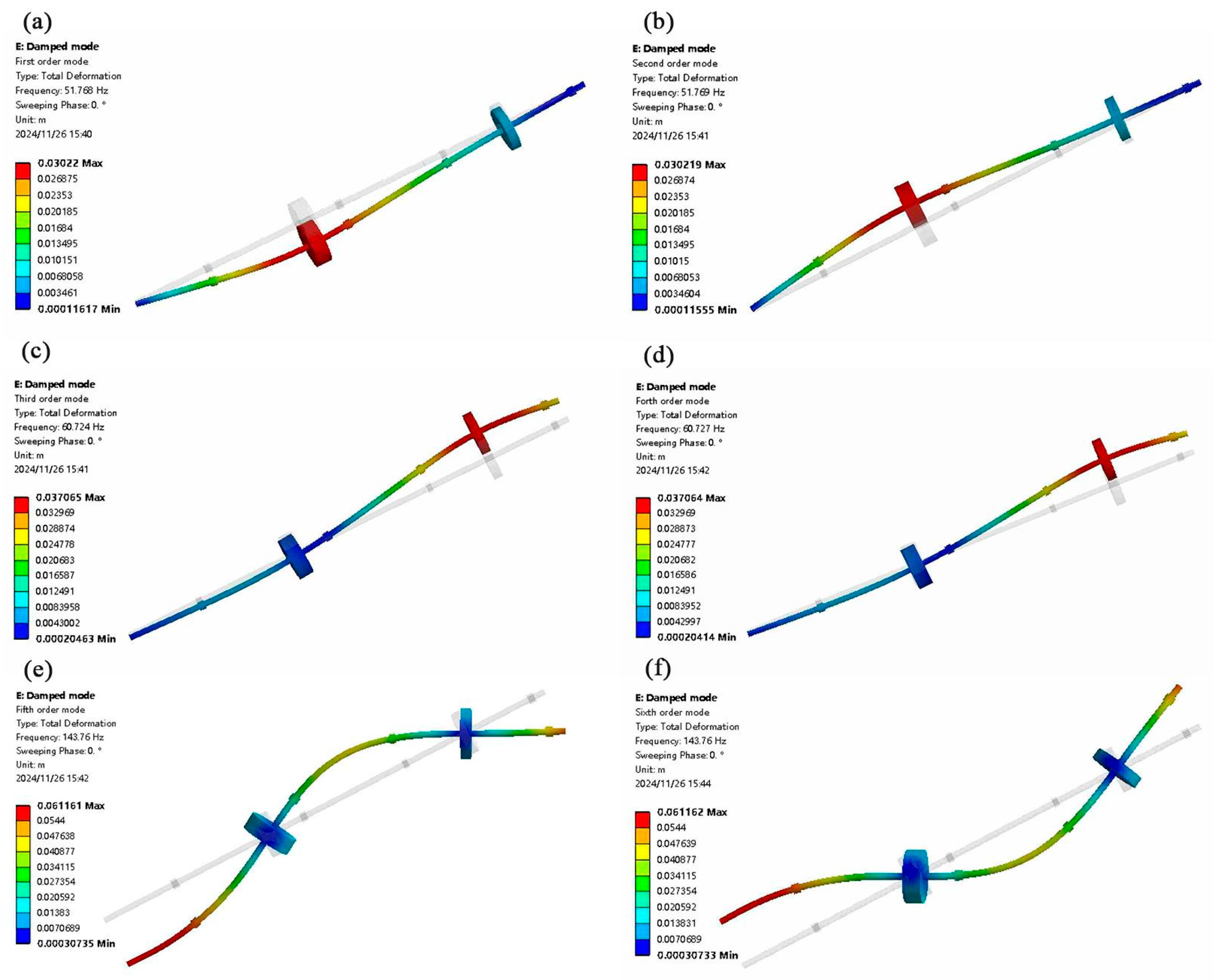 Figure 5 and Figure 6 show the first six intrinsic frequencies and mode shapes of the rotor system without applying the MR damper and with applying the MR damper, respectively. The critical speeds and intrinsic frequencies of the rotor system with and without applying the MR damper are presented in Table 6. As shown in Figure 5 and Figure 6 and Table 6, after applying the MR damper, the intrinsic frequencies of the first four modes are higher than those without the MR damper, indicating the increase in the system’s stiffness and damping force; however, for the fifth and sixth modes are close to that without the MR damper, attributed to the MR damper introducing energy dissipation to the rotor system, thereby attenuating its vibrations [33]. Moreover, resonance occurs when the system’s rotational frequency approaches or coincides with its intrinsic frequency; the rotational speed of the shaft at this intrinsic frequency is the critical speed [34]. From Table 6, it is revealed that for the first four modes, these critical speeds all increase greatly, indicating the effectiveness of the MR damper in vibration reduction.