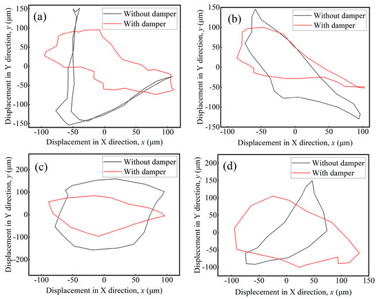 Axis loci appear at different critical speeds of the rotor system, as shown in Figure 7. As shown in Figure 7, no significant difference in the peak-to-peak value was observed along the X-direction before and after applying the MR damper. All axis loci exhibit non-circular patterns, indicating the asymmetric stiffness in the elastic supports. However, the axis loci exhibit approximate circular shapes after applying the MR damper. Moreover, as shown in Figure 7a–c, a significant decrease trend of the peak-to-peak value was observed along the Y-direction before and after applying the MR damper, indicating that the vibration reduction effect of this magnetorheological (MR) damper is only effective in the Y-direction. As shown in Figure 7d, the Y-direction displacement has not changed significantly after applying the MR damper, attributed to the decrease in yield stress of MRF during vibration. It can be seen from the results that rotor system vibrations effectively reduce after applying the MR damper at critical speeds [35].