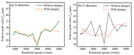Peak–peak value of rotor system vibration at different speeds: (a) sensor X-direction, (b) sensor Y-direction.
