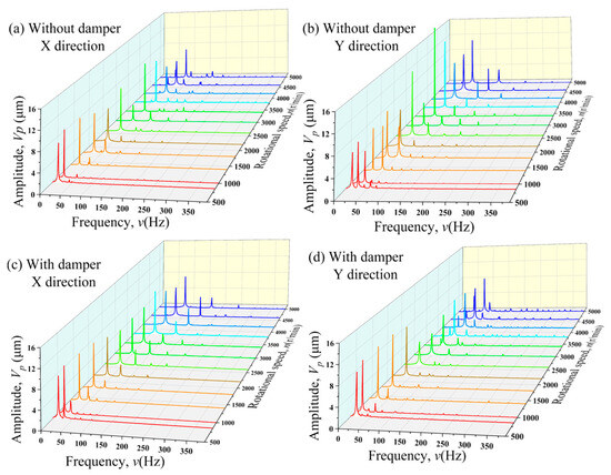Figure 9 shows the waterfall plots of rotor vibration displacement at different speeds. As seen in Figure 9, during the rotor vibration at various rotational speeds, multiple vibration frequencies generate. Only the first two vibration frequencies are typically considered, and the amplitudes at other vibration frequencies are very small and it is usually not given key attention. The 1× frequency of rotor vibration is related to rotor unbalance, while the 2× frequency is associated with initial shaft bending [36]. By comparing Figure 9a,c, it can be seen that the vibration frequency characteristics in the X-direction show no significant changes after applying the damper. By comparing Figure 9b,d, it can be seen that vibration displacement at 1× frequency decreases from 9.98 μm to 3.02 μm after applying the MR damper, representing a 69.74% reduction, in the Y-direction, at 2600 rpm. The vibration displacement at 1× frequency decreases from more than 11.89 μm to 4.08 μm after applying the MR damper, representing a 65.69% reduction, in the Y-direction, at 3200 rpm. Overall, the amplitude at 1× frequency becomes smoother than without the MR damper. In addition, the amplitude at 2× frequency also reduced significantly, especially in the speed range of 850–1800 r/min. These findings indicate that MR damper effectively reduces vibrations caused by rotor unbalance and initial shaft bending, especially in the Y-direction.