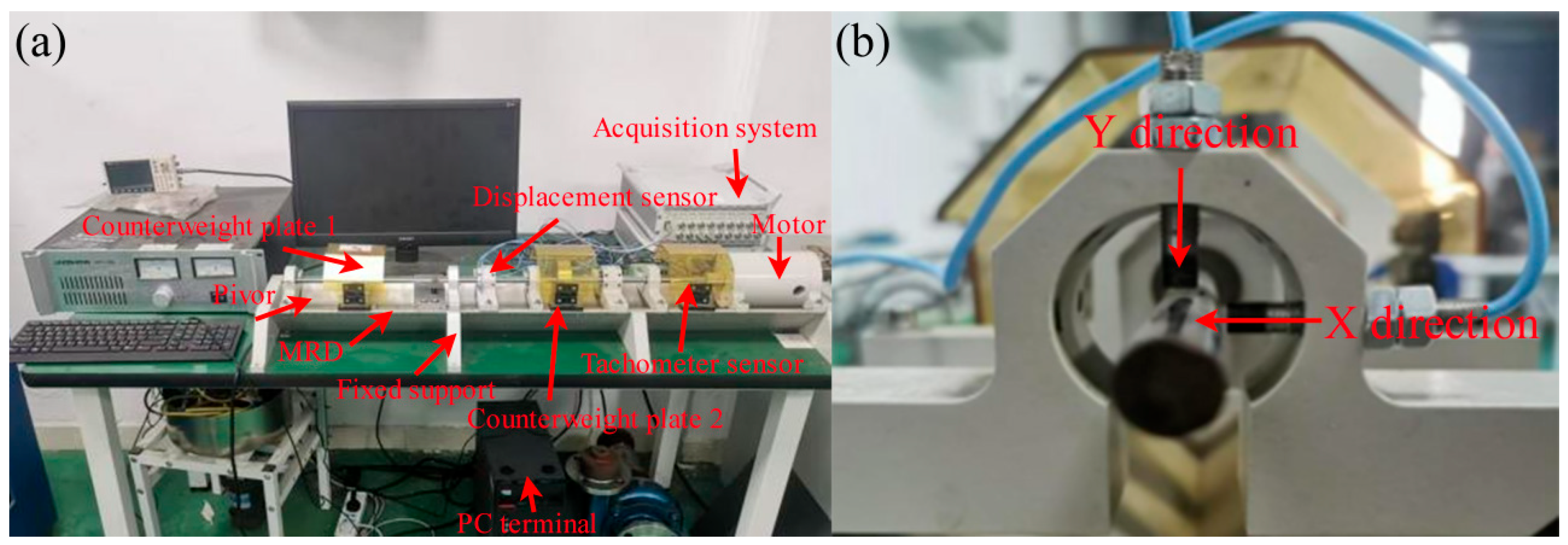 The vibration reduction effect experiment of the MR damper was conducted with and without the MR damper using the rotor system, as shown in Figure 2. Before the experiment, the test system and sensors were first calibrated. After the calibration, the rotational speed of the shaft varied from 1000 rpm to 5000 rpm, at 400 rpm intervals. The sampling frequency was set at 1000 Hz with a sampling duration of 60 s. The shaft rotational speed, and shaft displacements in both X-direction and Y-direction, were recorded by the DHDAS.