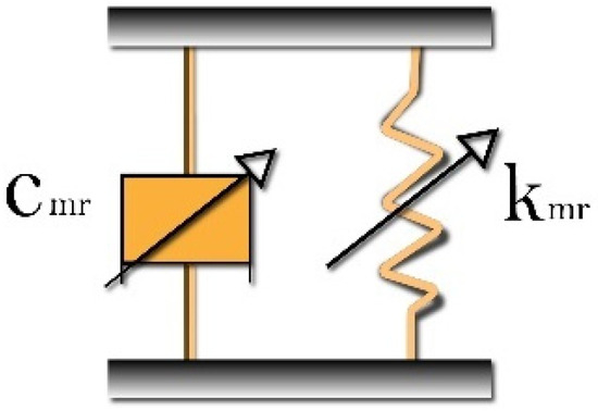 Magnetorheological (MR) materials belong to the category of smart materials, which can modify their rheological characteristics, like viscosity and dynamic modulus, under the influence of a magnetic field. Based on the medium used, MR materials are divided into two main types: magnetorheological fluids (MRFs) and magnetorheological elastomers (MREs). The production of MRE samples includes three main stages: mixing, molding, and curing [37]. In the case of MRFs, magnetic particles are dispersed within a carrier fluid. When an external magnetic field is applied, MRFs transform their structure from a liquid to a semi-solid state. MRFs are highly versatile, as demonstrated by their extensive engineering applications [38,39], due to their quiet operation and rapid response to magnetic fields [40]. Magnetorheological elastomer-fluid (MRE-F) is a hybrid material combining magnetorheological fluid (MRF) with a magnetorheological elastomer matrix [41,42,43]. The integration of MRF into the elastomer enhances the material’s ability to change its mechanical properties, such as stiffness and damping, in response to external magnetic fields which overcome the limitations of either material used alone [44] and allows for better adaptability and response to vibration control, particularly in semi-active control systems. MRE-F is mainly used in applications requiring real-time adjustments to vibrations, making it suitable for engineering systems like vibration absorbers. By altering the magnetic field, the material’s damping and stiffness can be precisely controlled to improve vibration reduction performance [36,45,46]. The behavior of MRE-F is modeled using a linear approach [36]. A simplified schematic is shown in Figure 1.