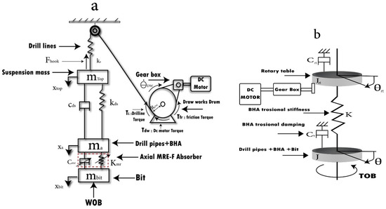 The hoisting mechanism initially holds the drill string in suspension. Using the drawworks’ drum, the drill line is extended, causing the drill string to lower gradually until the bit contacts the bottom-hole formation. At this stage, a fraction of the weight of the bottom-hole assembly (BHA), known as the applied weight on bit (WOBo), acts as an axial force exerted on the drill bit and then into the formation, enabling the cutter to move forward. Consequently, the hoisting mechanism controls the force applied (WOBo) to the bottom rock and the top axial speed of the drill string during drilling. Figure 3a illustrates the simplified axial model. The length from the crown block to the traveling block is represented by L. In the beginning, L is equal to the initial length (denoted as Lo), and its length increases via the drawworks’ drum until it equals the drill pipe length for each run, with the drill pipes stored in the stand. It is assumed that the drawworks’ drum is powered by a DC motor with armature control via the associated gearbox. The equations of motion, which describe the axial behavior of the drilling system—including the hosting system, suspension mass (top mass), BHA, and drill bit, along with the proposed axial MRE-F absorber—can be formulated as follows: